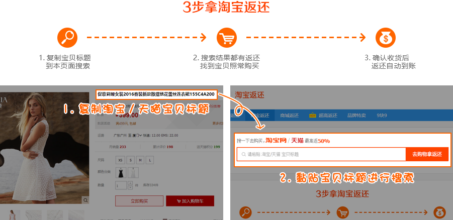 输入宝贝标题or关键词 ,点击“去购物拿返还”直达淘宝。